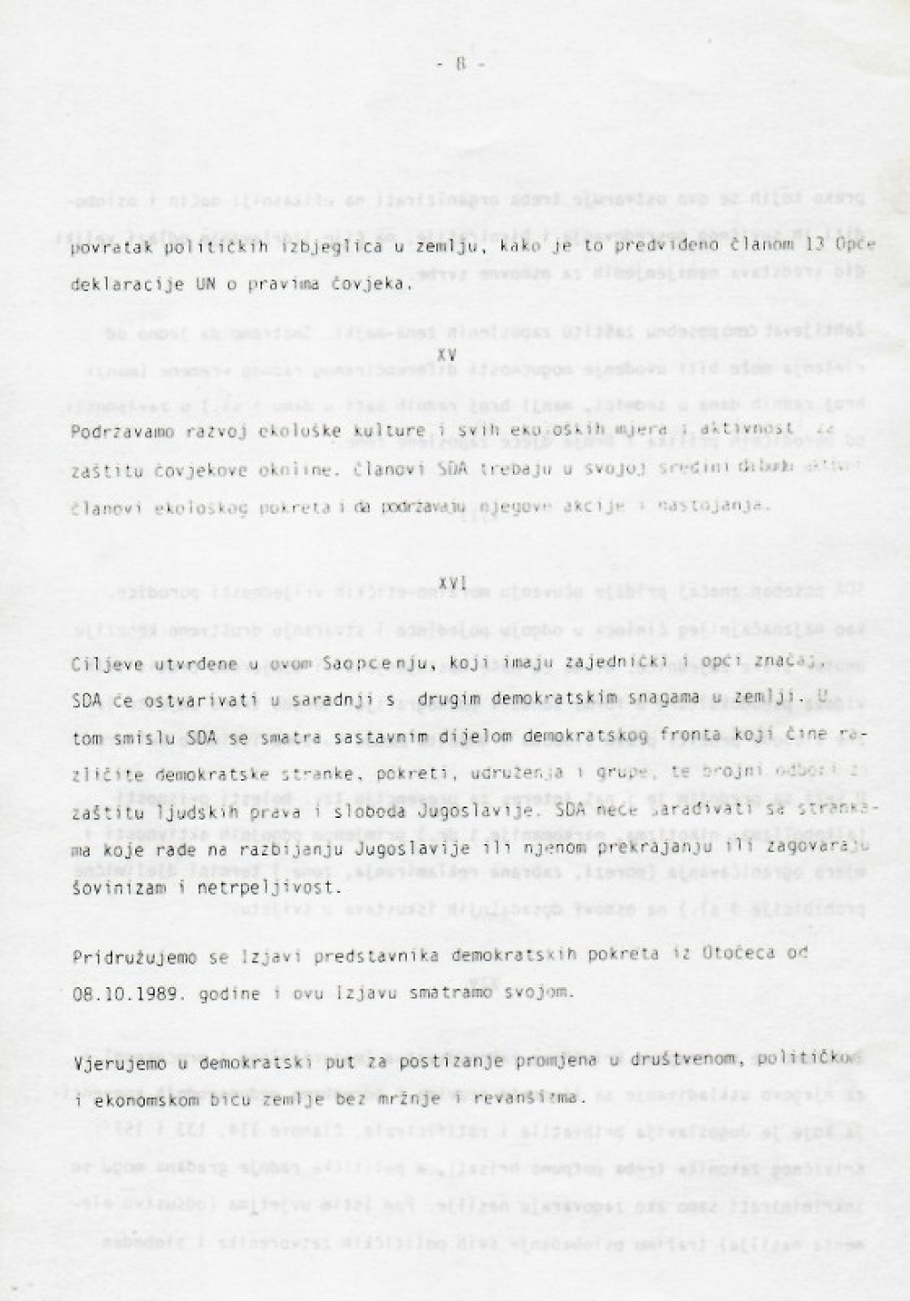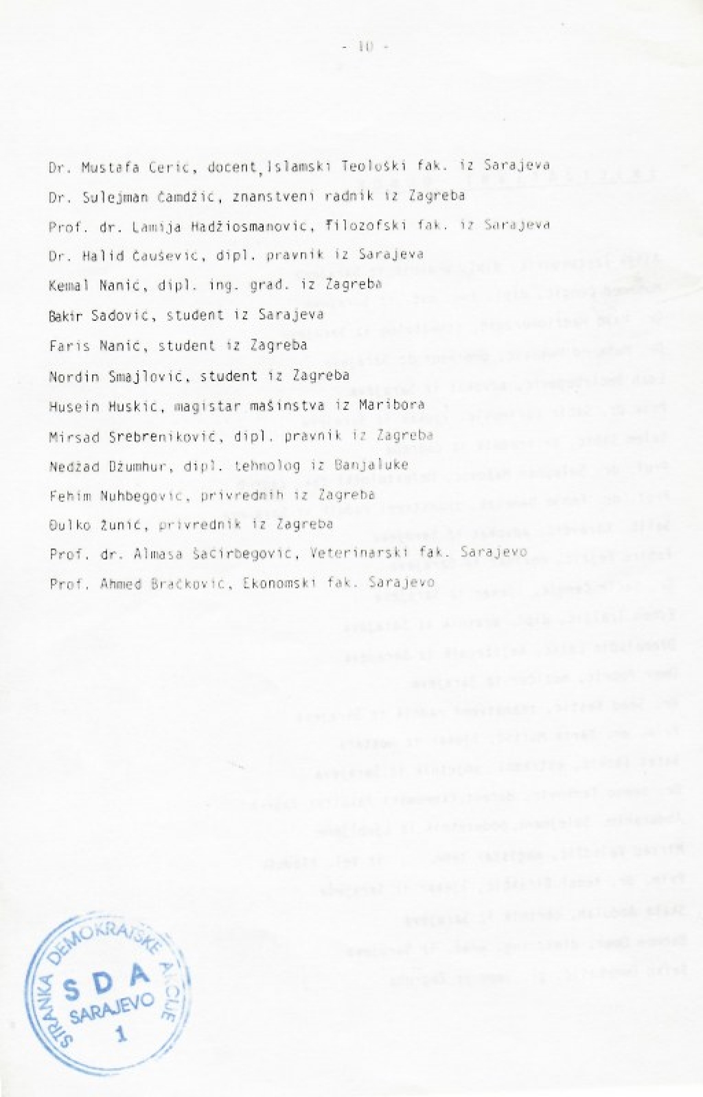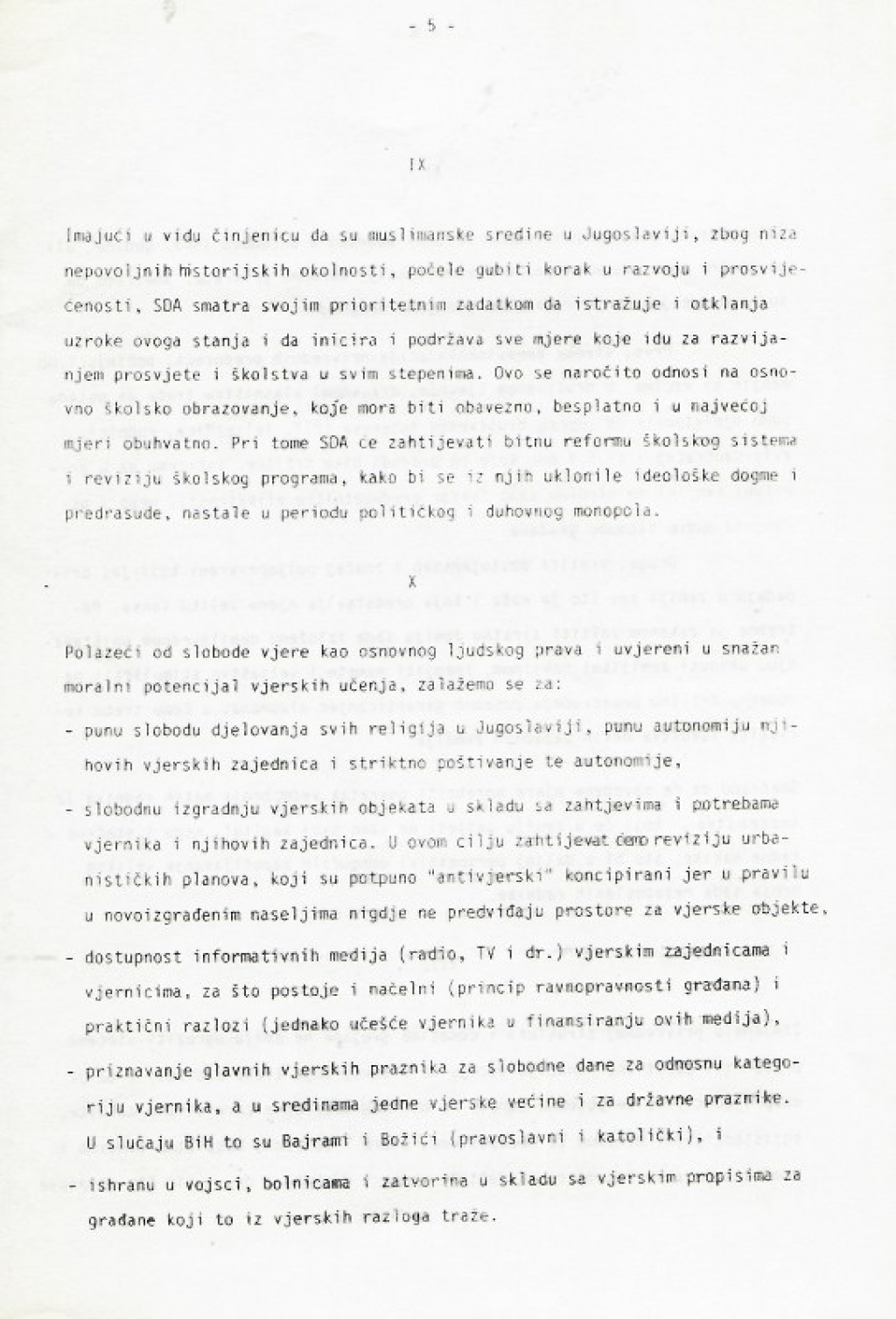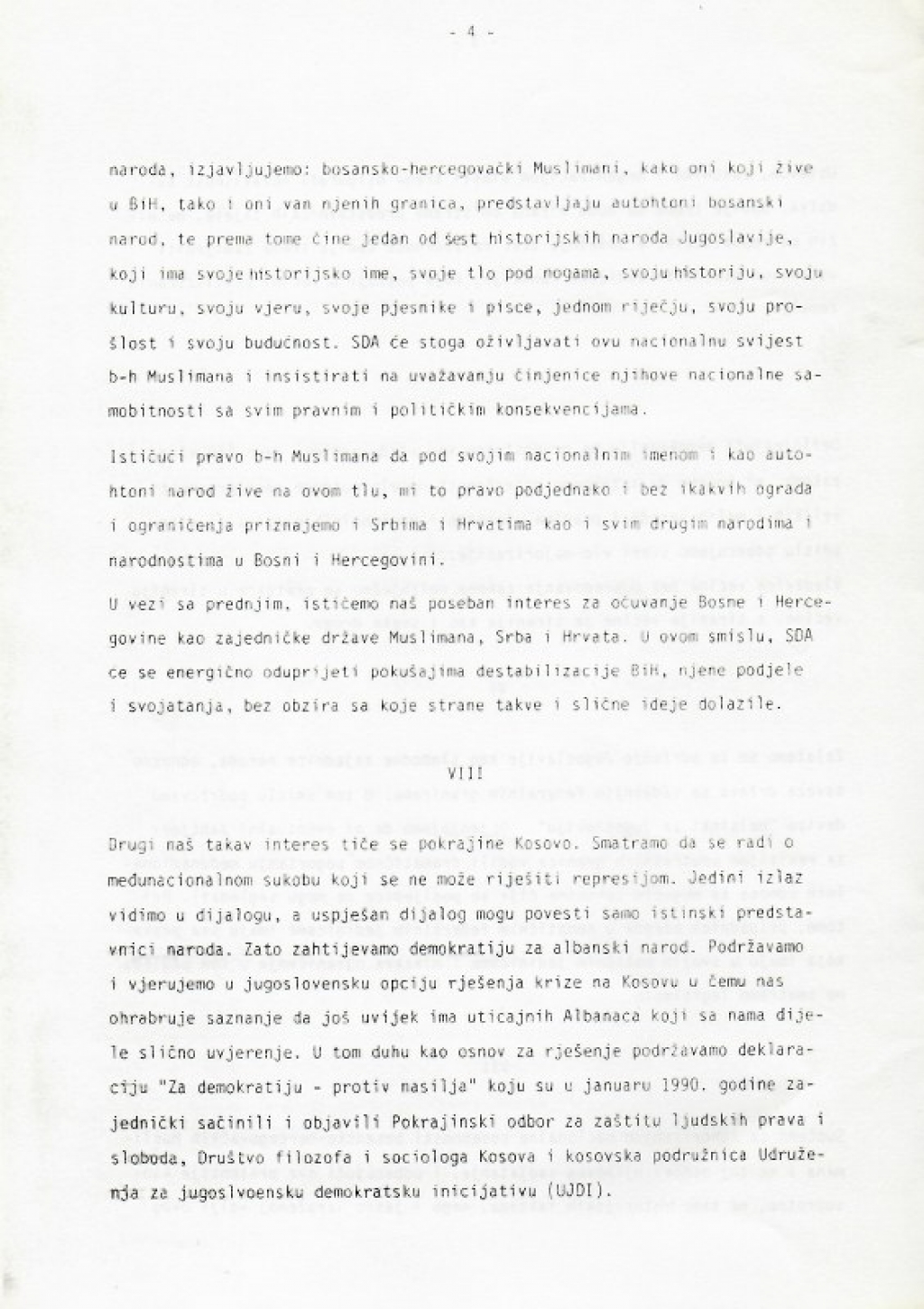 Suočeni sa ignoriranjem nacionalne posebnosti bosansko-hercegovačkih Muslimana i na toj osnovi njihovog svojatanja, i odbacujući ove pretenzije kao suprotne, ne samo historijskim faktima, nego i jasno izraženoj volji ovog naroda, izjavljujemo: bosansko-hercegovaćki Muslimani, kako oni koji žive u BiH, tako i oni van njenih granica, predstavljaju autohtoni bosanski narod, te prema tome čine jedan od šest historijskih naroda Jugoslavije, koji ima svoje historijsko ime, svoje tlo pod nogama, svoju historiju, svoju kulturu, svoju vjeru, svoje pjesnike i pisce, jednom riječju, svoju prošlost i svoju budućnost. SDA će stoga oživljavati ovu nacionalnu svijest b-h Muslimana i insistirati na uvažavanju činjenice njihove nacionalne samobitnosti sa svim pravnim i političkim konsekvencijama.