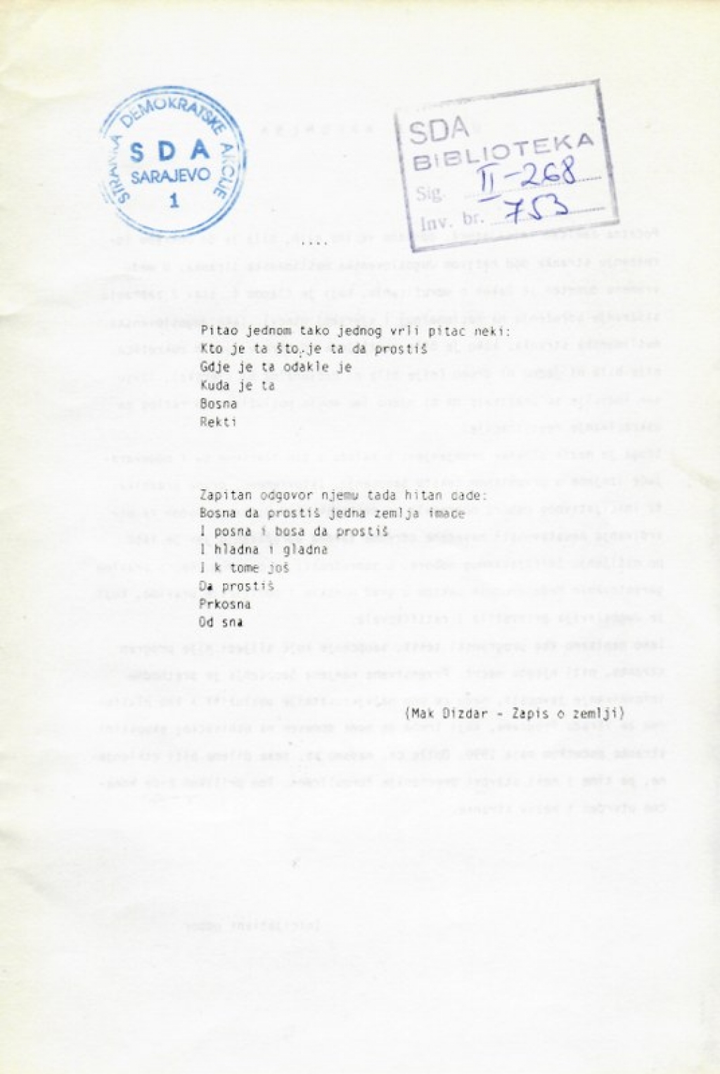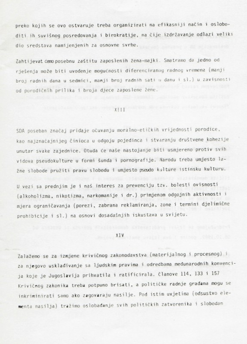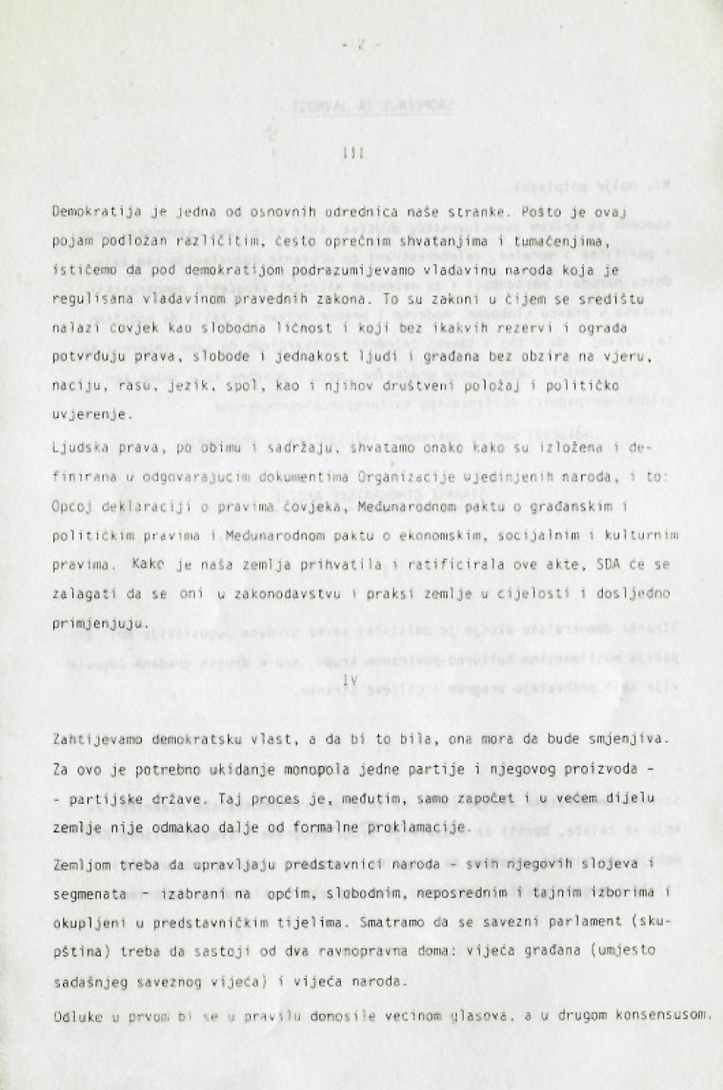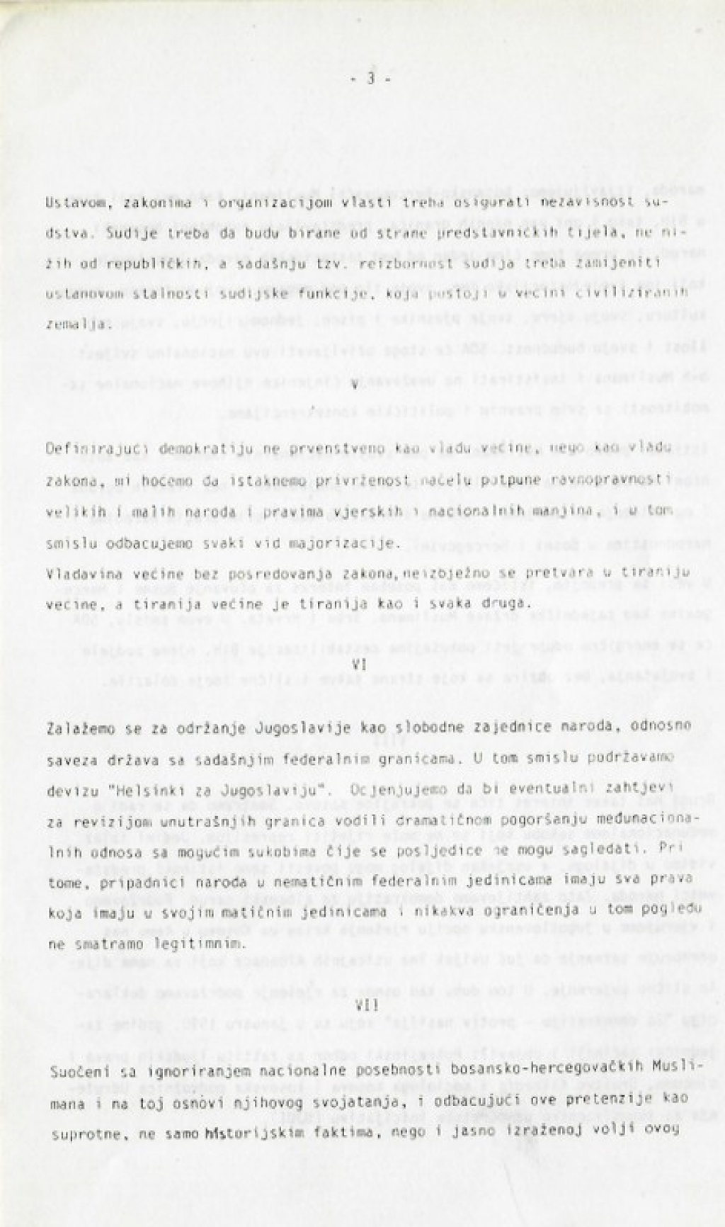 Suočeni sa ignoriranjem nacionalne posebnosti bosansko-hercegovačkih Muslimana i na toj osnovi njihovog svojatanja, i odbacujući ove pretenzije kao suprotne, ne samo historijskim faktima, nego i jasno izraženoj volji ovog naroda, izjavljujemo: bosansko-hercegovaćki Muslimani, kako oni koji žive u BiH, tako i oni van njenih granica, predstavljaju autohtoni bosanski narod, te prema tome čine jedan od šest historijskih naroda Jugoslavije, koji ima svoje historijsko ime, svoje tlo pod nogama, svoju historiju, svoju kulturu, svoju vjeru, svoje pjesnike i pisce, jednom riječju, svoju prošlost i svoju budućnost. SDA će stoga oživljavati ovu nacionalnu svijest b-h Muslimana i insistirati na uvažavanju činjenice njihove nacionalne samobitnosti sa svim pravnim i političkim konsekvencijama.