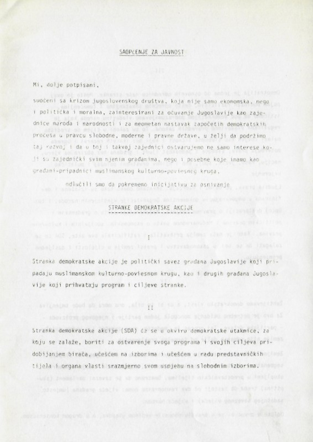 Ciljeve utvrđene u ovom Saopćenju, koji imaju zajednički i opći značaj, SDA će ostvarivati u saradnji s drugim demokratskim snagama u zemlji. U tom smislu SDA se smatra sastavnim dijelom demokratskog fronta koji čine različite demokratske stranke, pokreti, udruženja i grupe, te brojni odbori za zaštitu ljudskih prava i sloboda Jugoslavije. SDA neće sarađivat' sa strankama koje rade na razbijanju Jugoslavije ili njenom prekrajanju ili zagovaraju šovinizam i netrpeljivost.