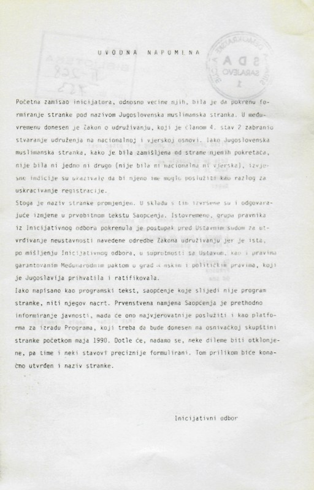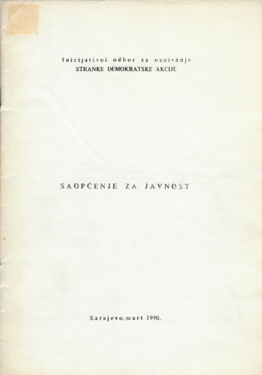 Iako napisano kao programski tekst, saopćenje koje slijedi nije program stranke, niti njegov nacrt. Prvenstvena namjena Saopćenja je prethodno informiranje javnosti, mada će ono najvjerovatnije poslužiti i kao platforma za izradu Programa, koji treba da bude donesen na osnivačkoj skupštini stranke početkom maja 1990. Dotle će, nadamo se, neke dileme biti otklonjene, pa time i neki stavovi preciznije formulirani. Tom prilikom biće konačno utvrđen i naziv stranke.