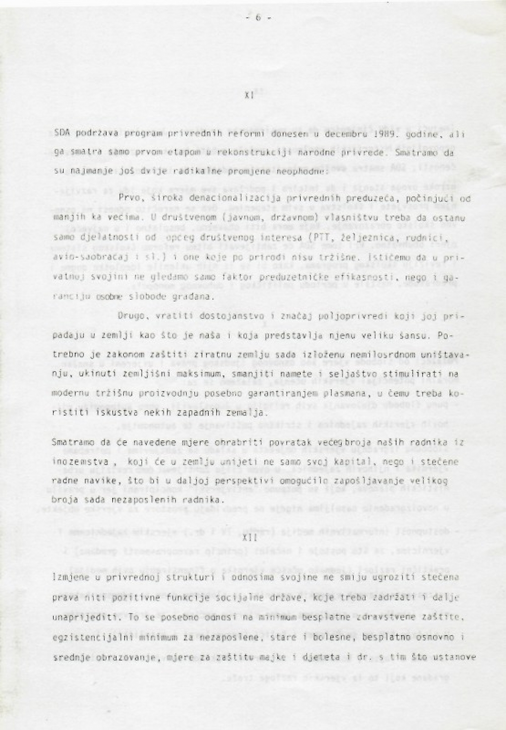 SDA podržava program privrednih reformi donesen u decembru 1989. godine, ali ga smatra samo prvom etapom u rekonstrukciji narodne privrede. Smatramo da su najmanje još dvije radikalne promjene neophodne: